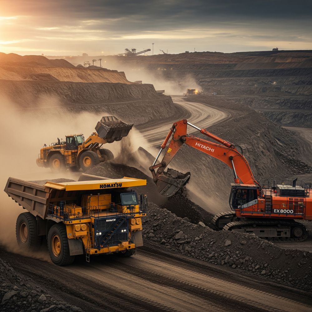 Komatsu: Excavadoras, cargadores frontales y camiones para gran minería. - Hitachi:Maquinaria para minería de alta productividad y precisión.