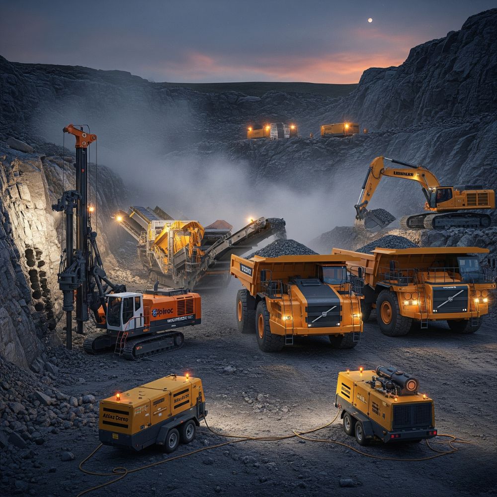 Volvo CE:Cargadores, excavadoras y camiones para operaciones mineras. - Liebherr:Camiones rígidos, palas hidráulicas y perforadoras. - Epiroc:Perforadoras, martillos hidráulicos y automatización subterránea. - Sandvik:Equipos de perforación, trituración y soluciones digitales. - Atlas Copco: Sistemas de aire comprimido y perforación para minería.